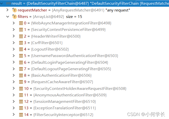 我们可以通过Debug查看当前系统中SpringSecurity过滤器链中有哪些过滤器及它们的顺序。
