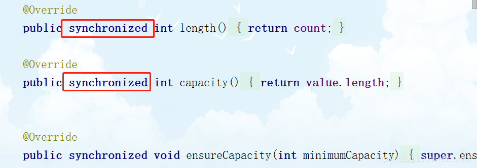 由此可见,StringBuffer类中的方法都添加了synchronized关键字,也就是给这个方法添加了一个锁,用来保证线程安全。