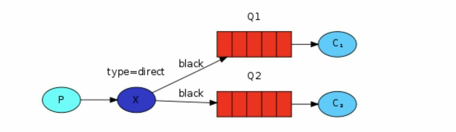 在上面这张图中,我们可以看到 X 绑定了两个队列,绑定类型是 direct。队列Q1 绑定键为 orange, 队列 Q2 绑定键有两个:一个绑定键为 black,另一个绑定键为 green.