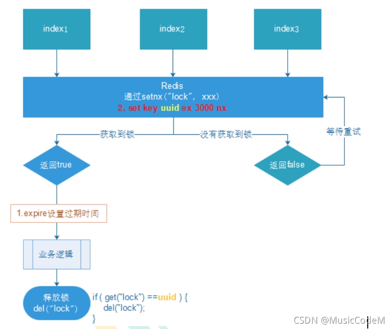 问题:删除操作缺乏原子性。 场景: 1.index1执行删除时,查询到的lock值确实和uuid相等 uuid=v1 set(lock,uuid);