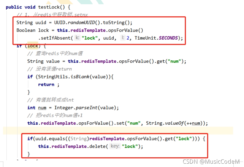 1.定义key,key应该是为每个sku定义的,也就是每个sku有一把锁。 String locKey =“lock:”+skuId; // 锁住的是每个商品的数据 Boolean lock = redisTemplate.opsForValue().setIfAbsent(locKey, uuid,3,TimeUnit.SECONDS);